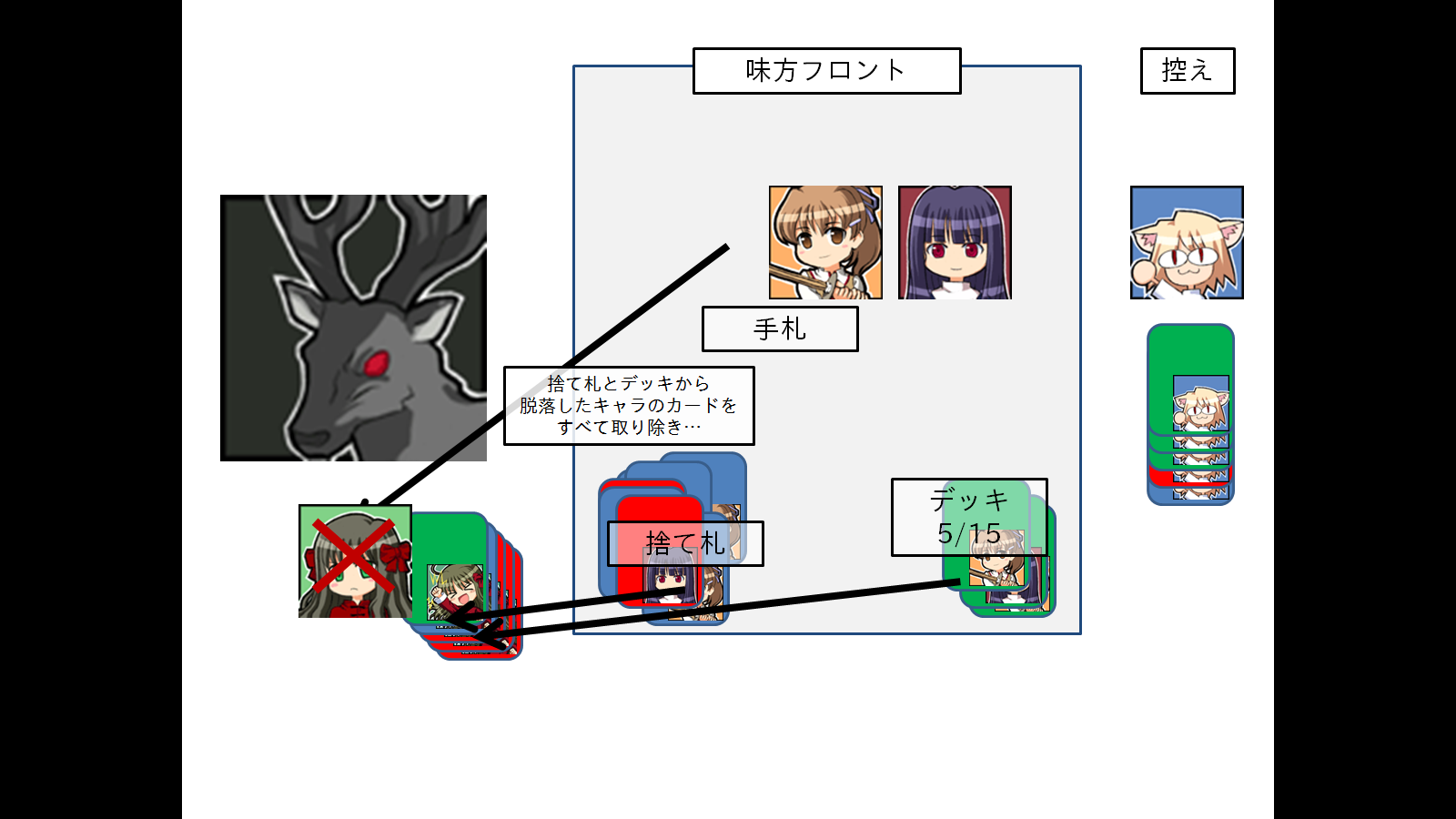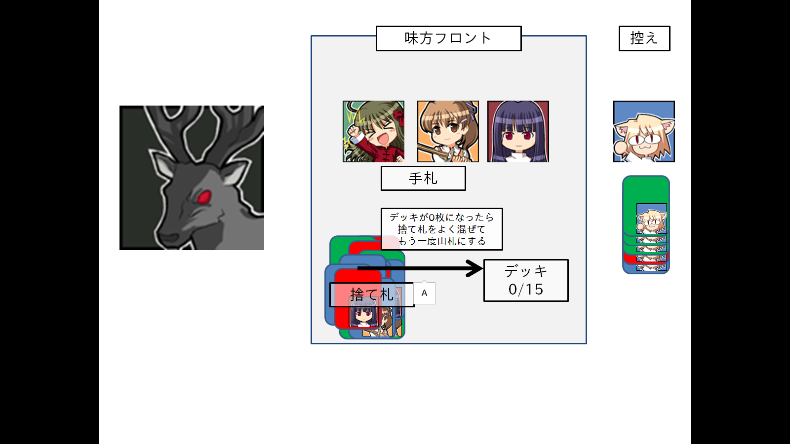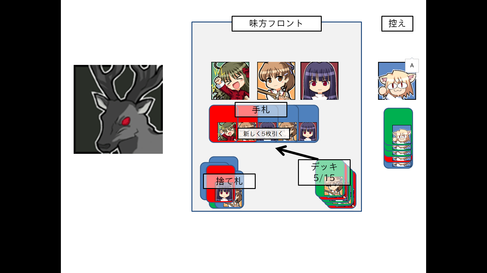 控えキャラの持ち札と捨て札をすべて山に加えて切り直す。これで山札の枚数は5の倍数になるから、毎回5枚引いてちょうど山が切れるまで引ききれる。ちなみに、残りキャラが2人しかいないときには山札は10枚、1人のときは5枚ということになって、どちらの場合でも毎回手札を5枚引くことができる。