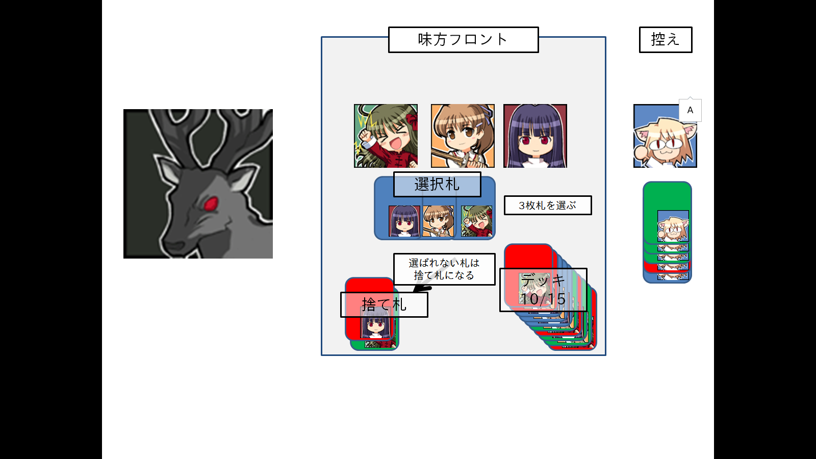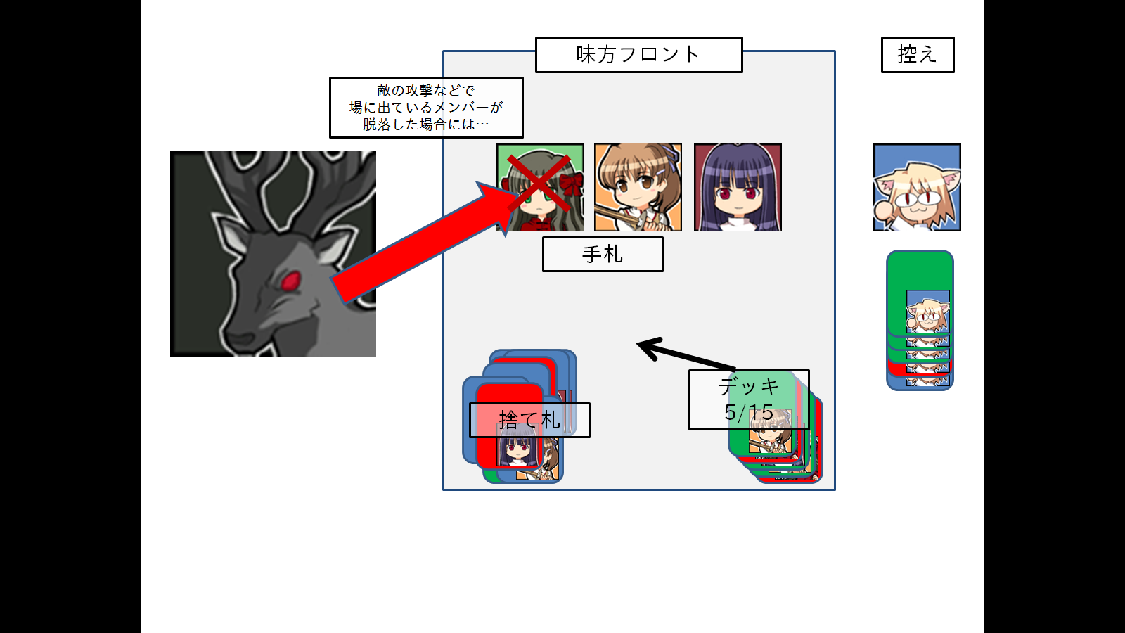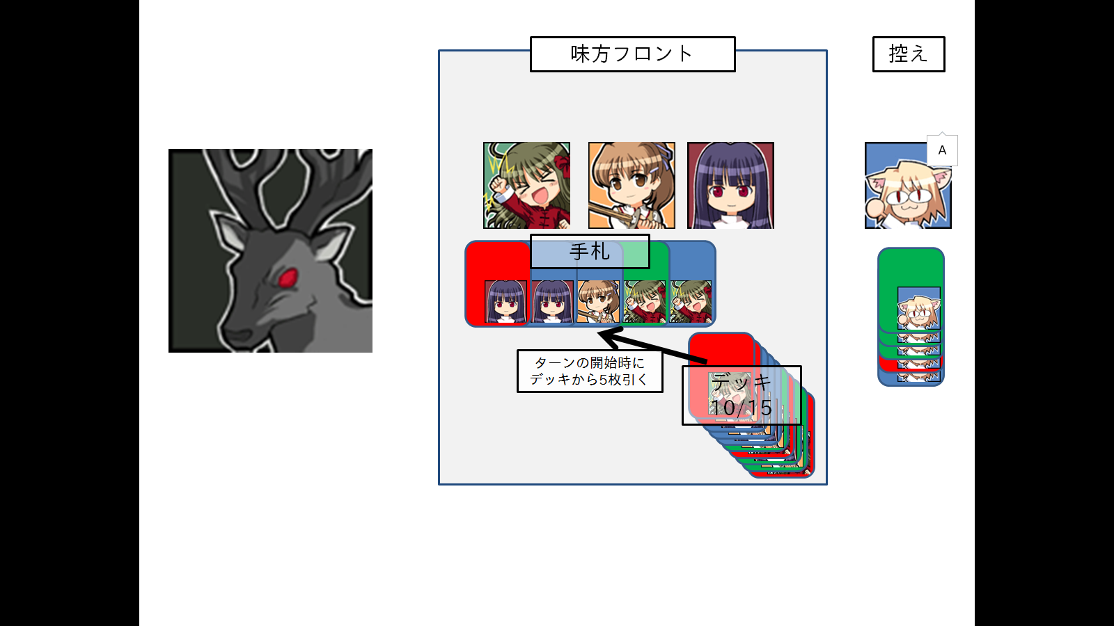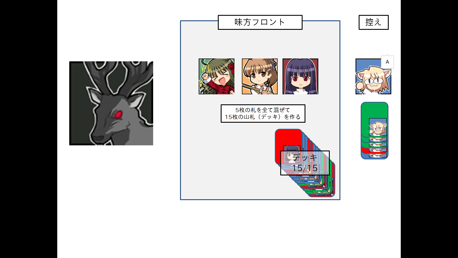 控えキャラの持ち札と捨て札をすべて山に加えて切り直す。これで山札の枚数は5の倍数になるから、毎回5枚引いてちょうど山が切れるまで引ききれる。ちなみに、残りキャラが2人しかいないときには山札は10枚、1人のときは5枚ということになって、どちらの場合でも毎回手札を5枚引くことができる。
