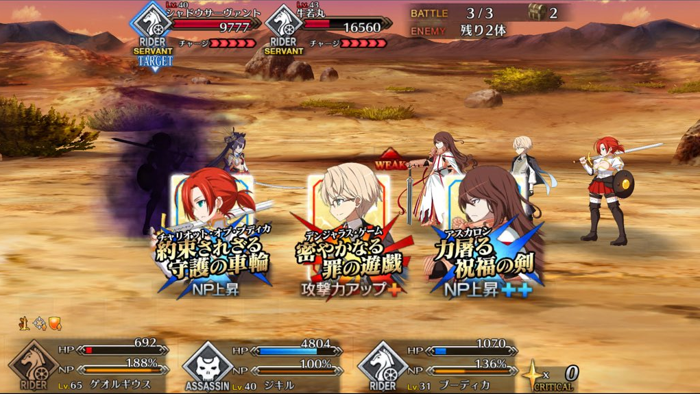 数値変化を見やすくするために、ダメージの大きい、牛若の宝具を利用した。